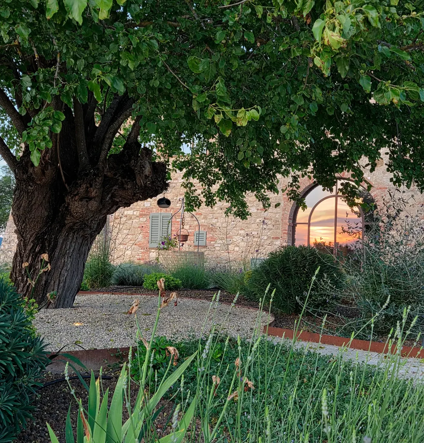 A beautiful example of Mediterranean drought-resistant planting that adapts to the Tuscan climate, focusing on sustainable design principles and using native plants that require minimal maintenance.